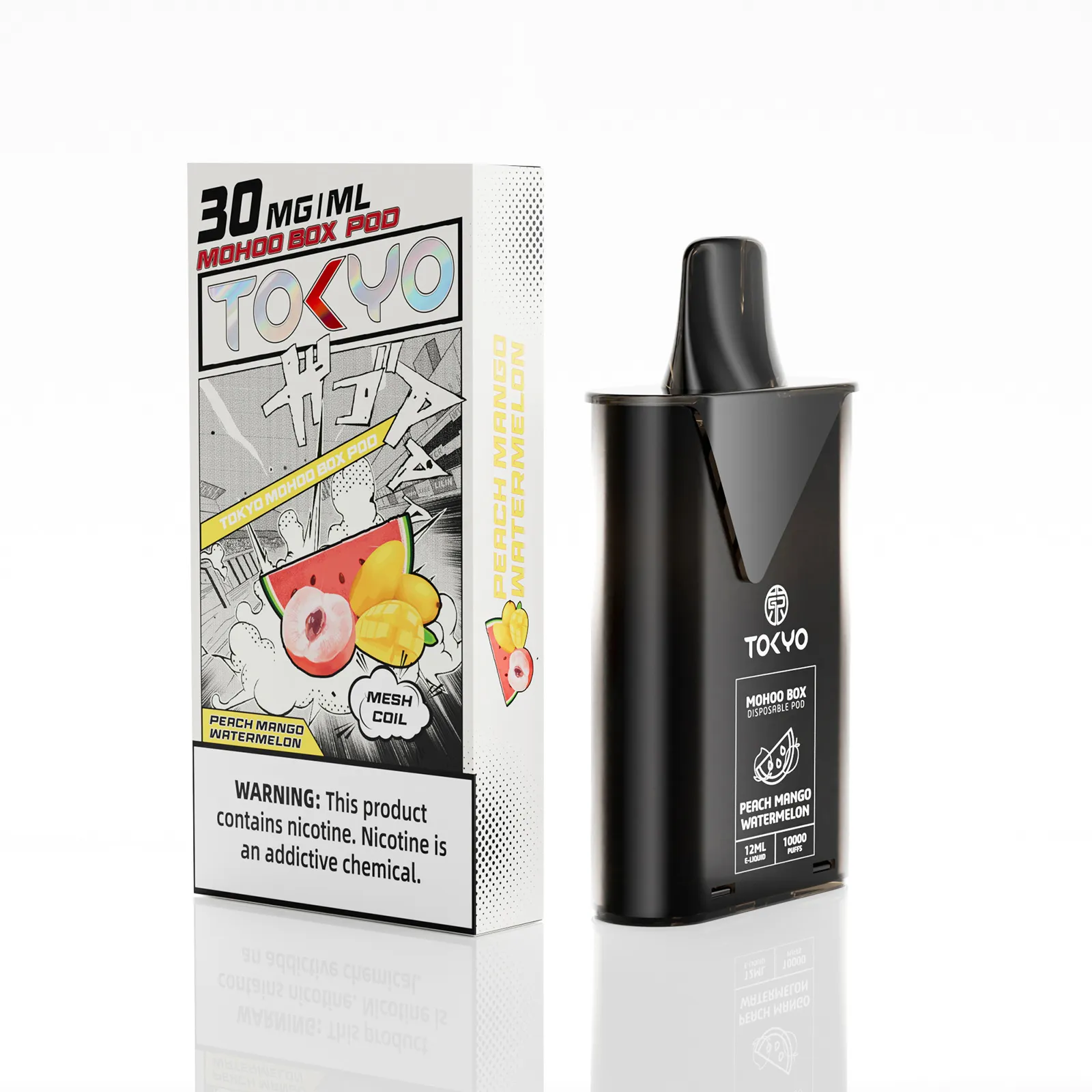 東京魔盒電子煙煙彈採用植物甘油與丙二醇基底,搭配高純度尼古丁鹽,容量 12 mL、尼古丁強度 30 mg/mL(3%),搭載 1.0Ω 鋼網棉霧化芯,設計為一次性 pod,約 10,000 口,吸引力持久。